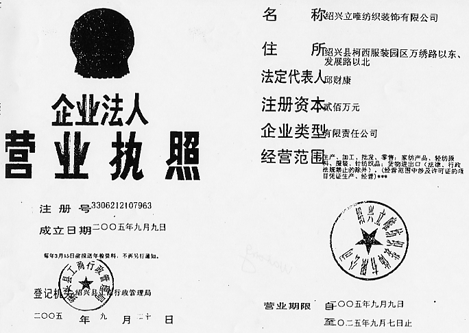 | 統(tǒng)一社會信用代碼/營業(yè)執(zhí)照注冊號: | 3306212107963 | 名稱: | 紹興立唯紡織裝飾有限公司 |