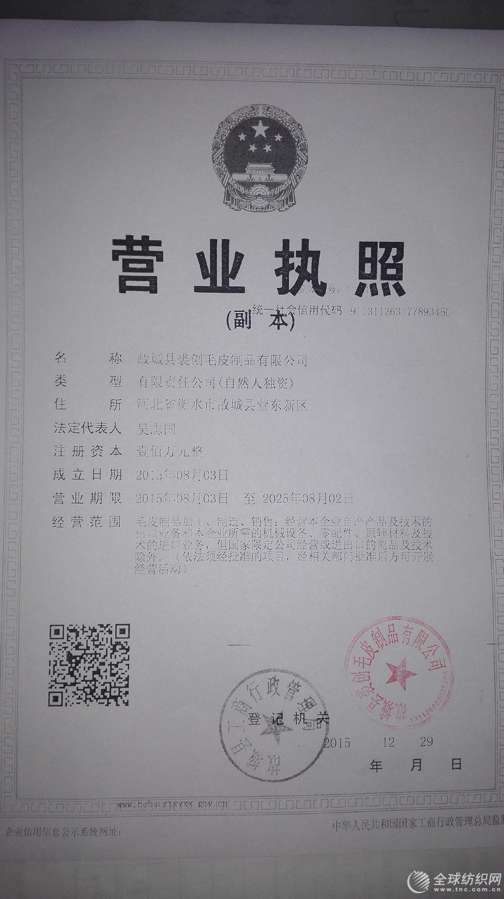 | 統(tǒng)一社會(huì)信用代碼/營(yíng)業(yè)執(zhí)照注冊(cè)號(hào): | 91131126347789346C | 名稱: | 故城縣裘創(chuàng)毛皮制品有限公司 |