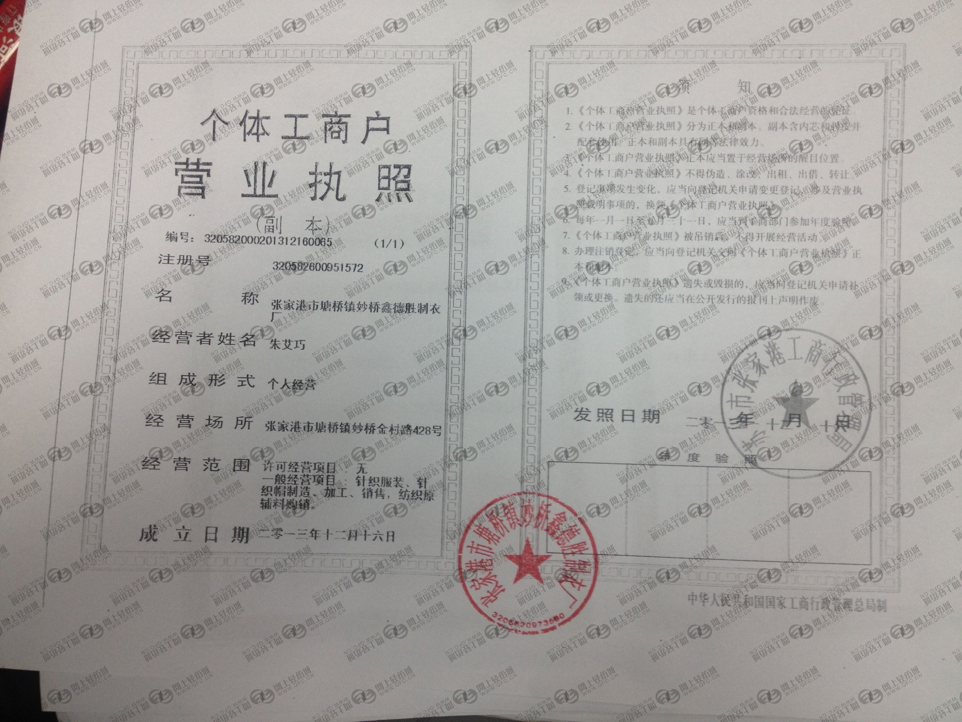 張家港市塘橋鎮(zhèn)妙橋鑫德勝制衣廠