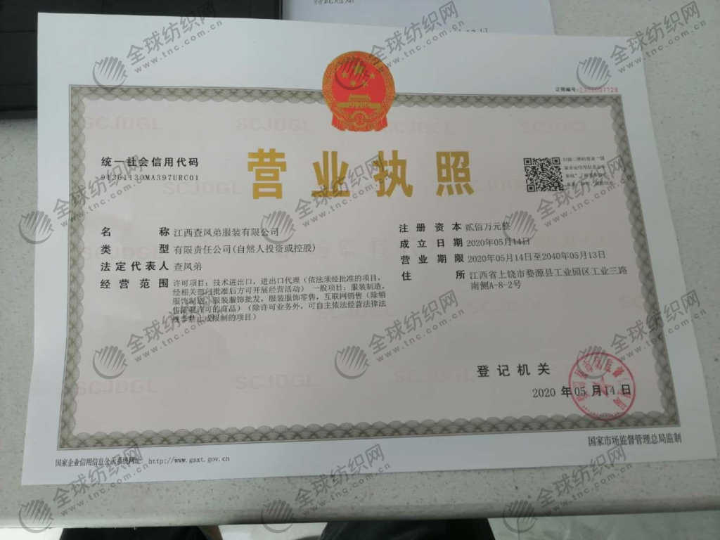 | 統(tǒng)一社會信用代碼/營業(yè)執(zhí)照注冊號: | 91361130MA397URC01 | 名稱: | 江西查鳳弟服裝有限公司 |