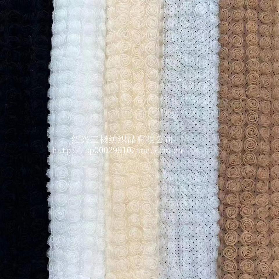 HX0146614 定制加工 網(wǎng)紗植絨圓點玫瑰盤花 三合一盤帶繡花面料 服裝布料