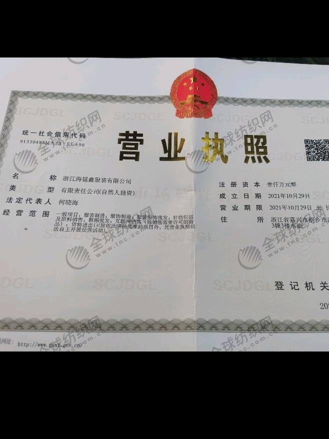 | 統(tǒng)一社會信用代碼/營業(yè)執(zhí)照注冊號: | 91330483MA7BYELA90 | 名稱: | 浙江海錳鑫服裝有限公司 |