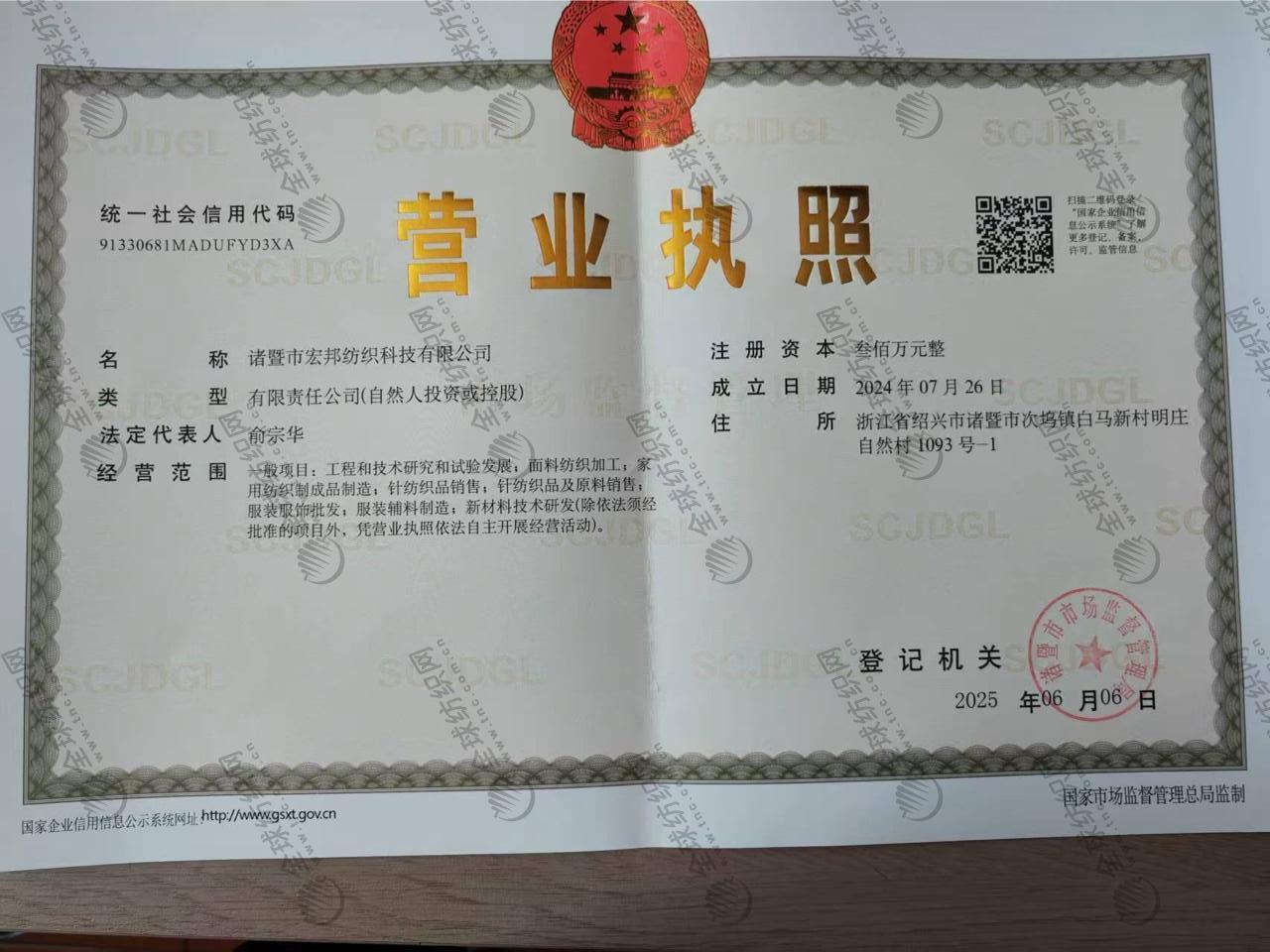 | 統(tǒng)一社會(huì)信用代碼/營(yíng)業(yè)執(zhí)照注冊(cè)號(hào): | 91330681MADUFYD3XA | 名稱(chēng): | 諸暨市宏邦紡織科技有限公司 |