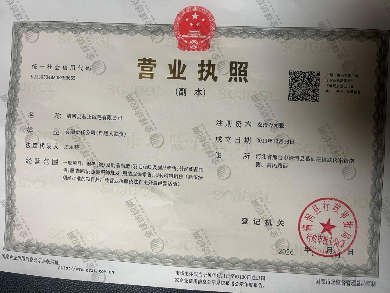 | 統(tǒng)一社會信用代碼/營業(yè)執(zhí)照注冊號: | 92130534MA0EEMB655 | 名稱: | 清河縣茗正絨毛有限公司 |