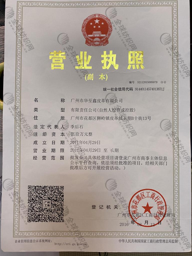 | 統(tǒng)一社會信用代碼/營業(yè)執(zhí)照注冊號: | 91440114574013871J | 名稱: | 廣州市華至鑫皮革有限公司 |