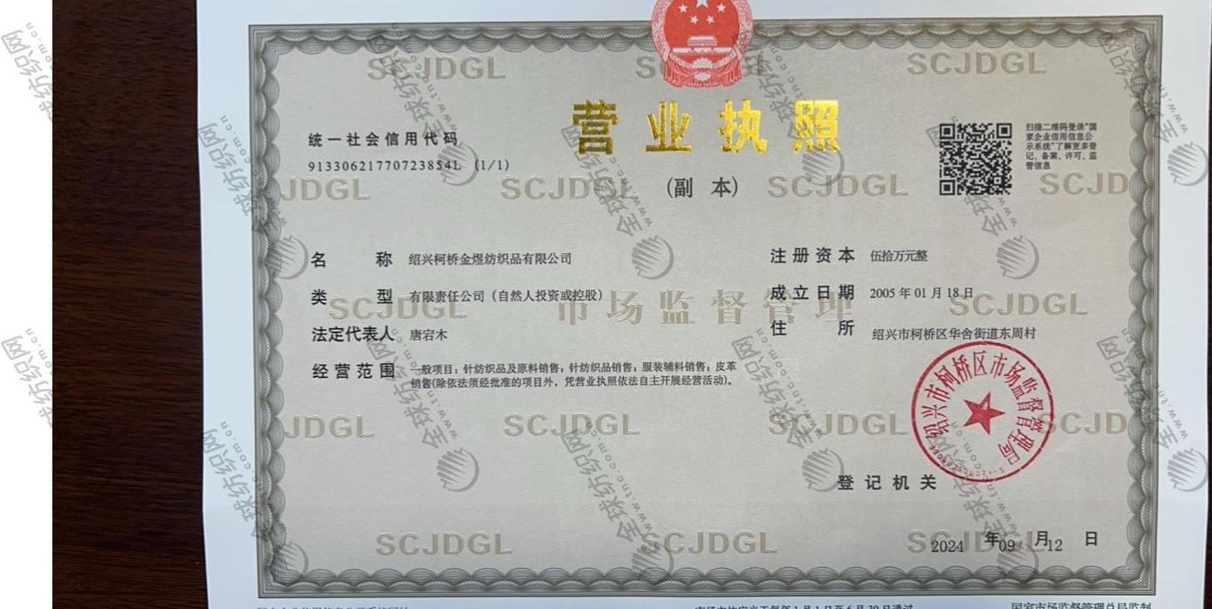 | 統(tǒng)一社會信用代碼/營業(yè)執(zhí)照注冊號: | 91330621770723854L | 名稱: | 紹興柯橋金煜紡織品有限公司 |
