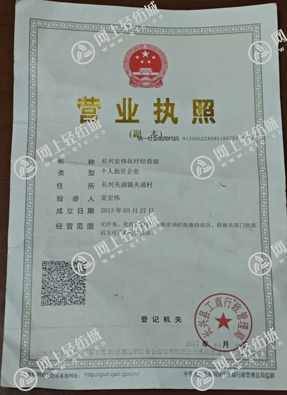 | 統(tǒng)一社會信用代碼/營業(yè)執(zhí)照注冊號: | 91330522X095183751 | 名稱: | 長興宏偉化纖經(jīng)營部 |