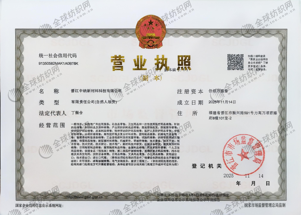 | 統(tǒng)一社會(huì)信用代碼/營業(yè)執(zhí)照注冊(cè)號(hào): | 91350582MAK1A0BT6K | 名稱: | 晉江中納新材料科技有限公司 |