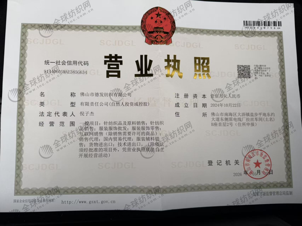 | 統(tǒng)一社會(huì)信用代碼/營(yíng)業(yè)執(zhí)照注冊(cè)號(hào): | 91440605MAE385G634 | 名稱: | 佛山市德發(fā)紡織有限公司 |