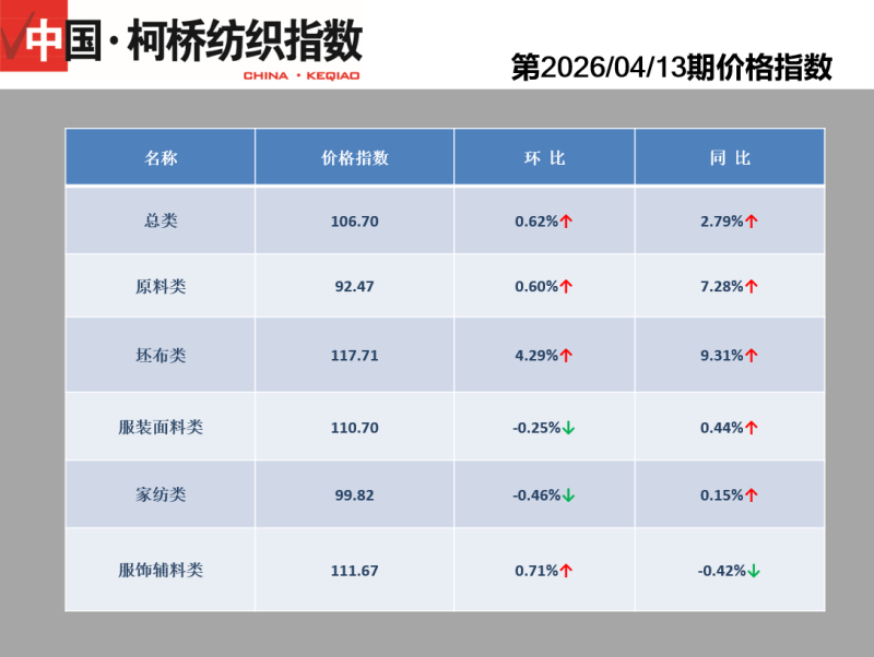 中國·柯橋紡織指數(shù)|第2026/04/13期價格指數(shù)