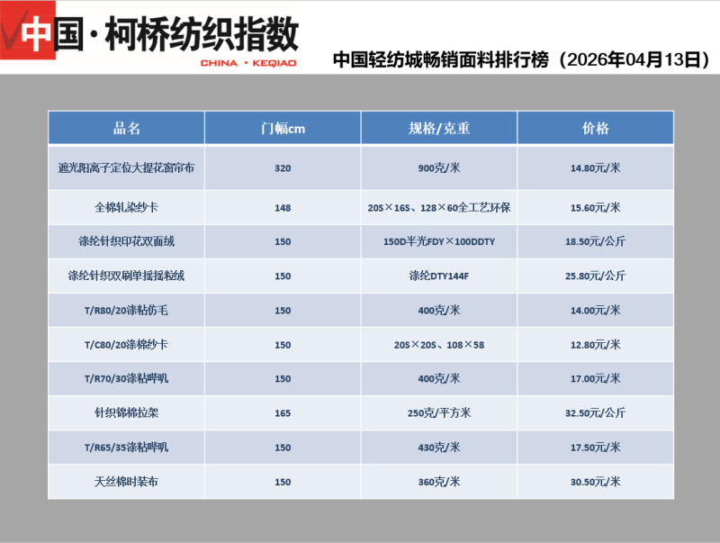 中國·柯橋紡織指數(shù)|中國輕紡城暢銷面料排行榜(2026年04月13日)